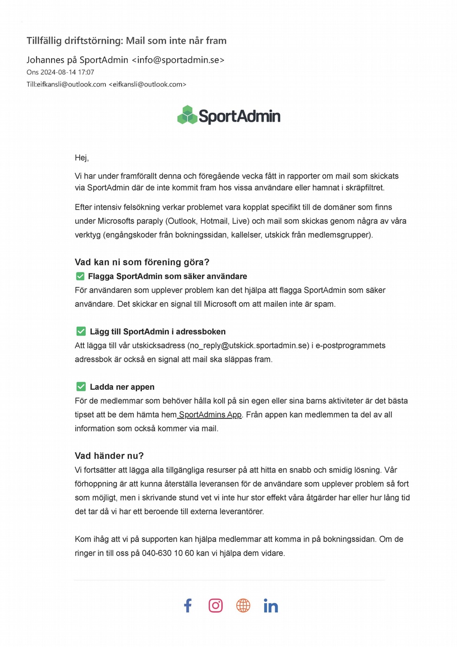 Tillfällig driftstörning SportAdmin